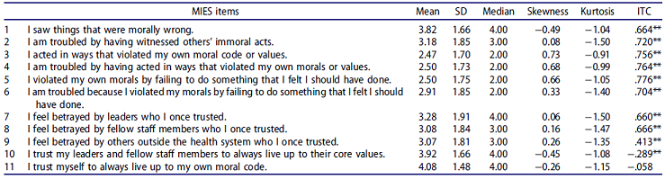 Le correlazioni a basso intervallo con le misure del disagio psicologico potrebbero potenzialmente indicare che la ferita morale, che evidenzia giudizi di valore cognitivo piuttosto che la sintomatologia manifesta, può spiegare in modo univoco una certa quantità di varianza.